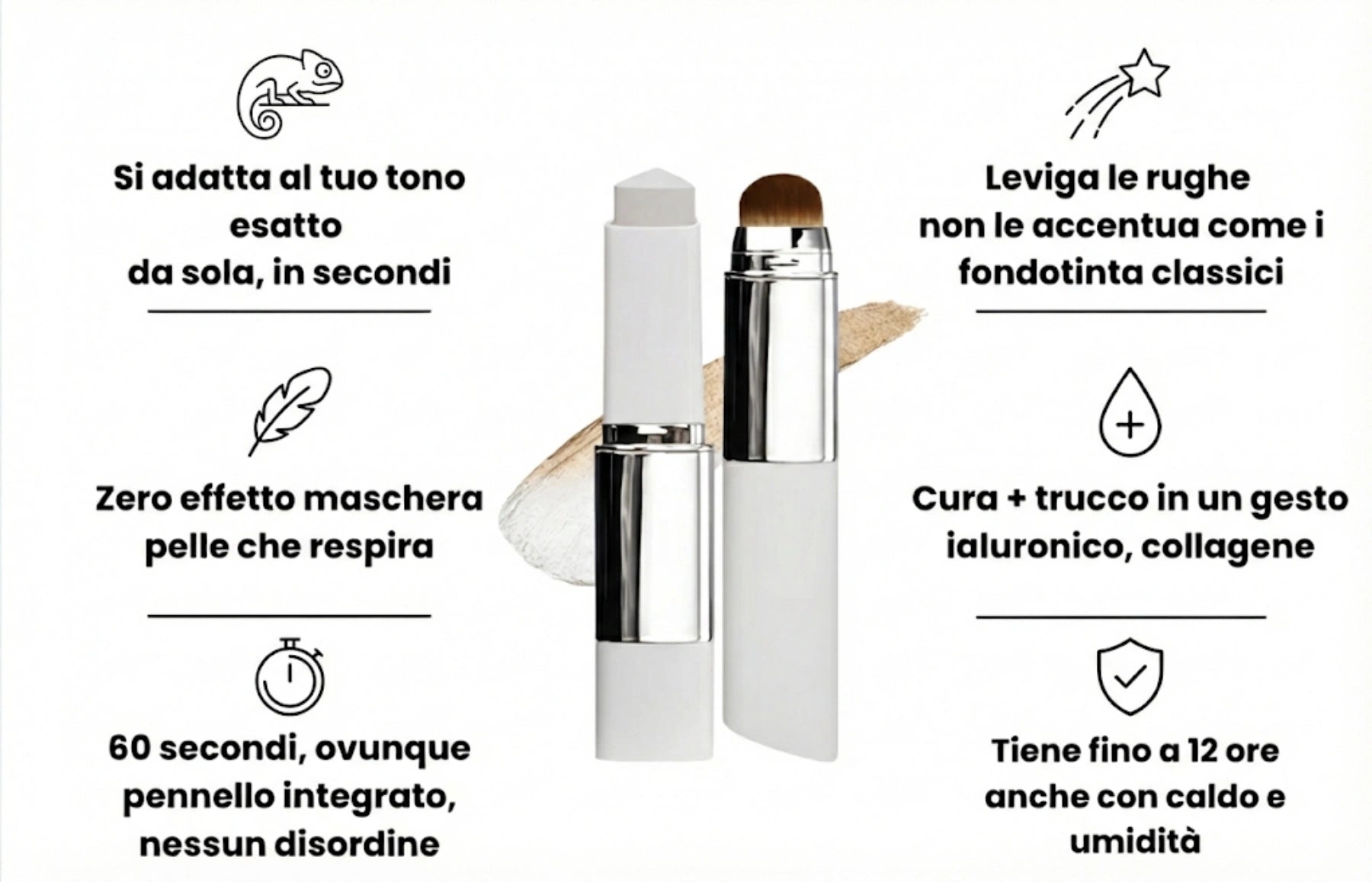 Grazie alla tecnologia dei pigmenti adattativi, microcapsule che reagiscono al contatto con la pelle e si trasformano nel tuo tono esatto in pochi secondi. Si applica bianco, sfumi con il pennello integrato, e diventa il tuo colore. È normale essere scettiche la prima volta. Le nostre clienti ci sono rimaste tutte stupite.