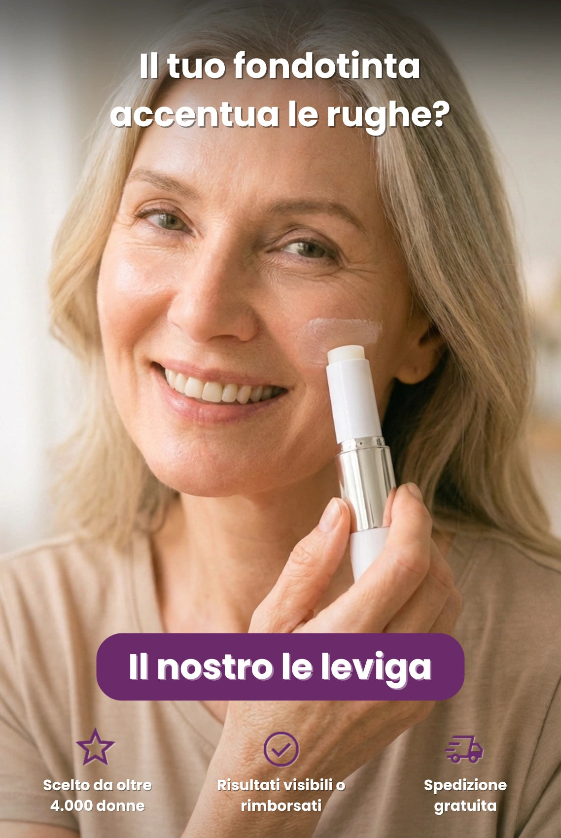 Offriamo una garanzia soddisfatte o rimborsate di 60 giorni. Se non vedi risultati o non ti piace, ti rimborsiamo completamente, senza domande. Il rischio è zero. L'unica cosa che puoi perdere è continuare a usare un fondotinta che non ti ha mai convinta.